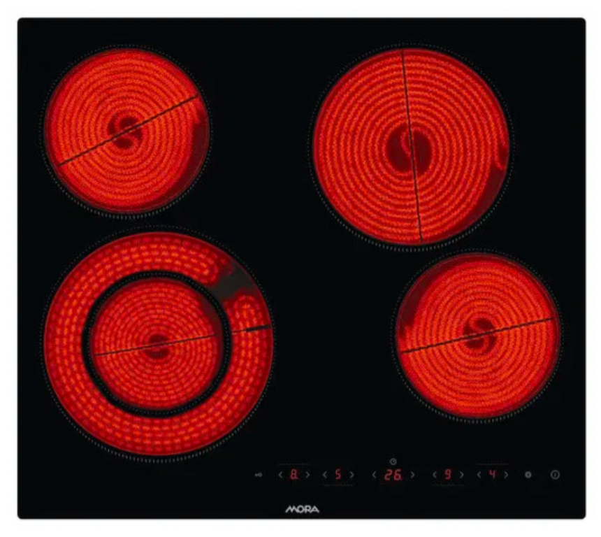 Díky sklokeramické varné desce MORA jednoduše uvaříte vše, na co budete mít chuť. Sklokeramická varná deska nabízí pokročilé funkce, moderní design, odolný povrch a snadnou údržbu. Její klasický design je vhodný téměř do každé kuchyně. Varnou desku bez rámečku doplňují broušené. Zaujme vás 4 plotýnkami, tudíž s ní uvaříte najednou více jídel. Je určena k zapuštění do kuchyňské desky. Zatímco černá barva přináší moderní styl, kvalitní materiály zase dlouhodobou životnost. Jejím materiálem je černé sklo a povrch desky je také skleněný. Varná deska při své práci využívá 400 V. Rozměry varné desky MORA jsou 11,5 × 59 × 52 cm (vך×h).